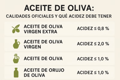 Aceite de oliva: calidades oficiales y qué acidez debe tenerQué significan extra virgen, virgen y lampante; qué es realmente la “acidez % oleico”; cómo se evalúa por panel y qué mirar en la etiqueta para elegir bien.
